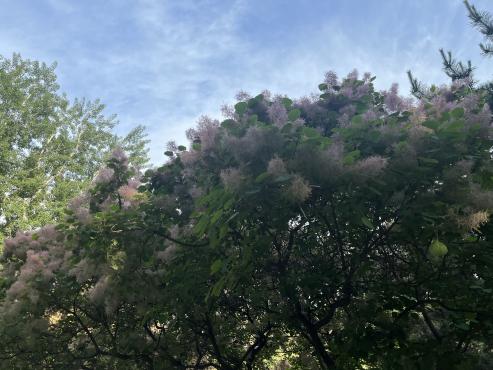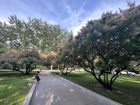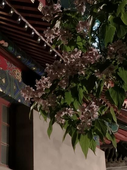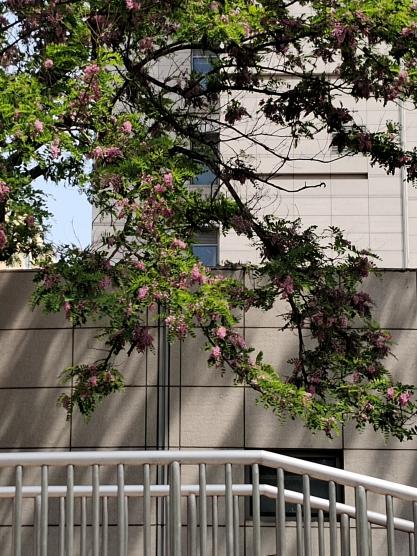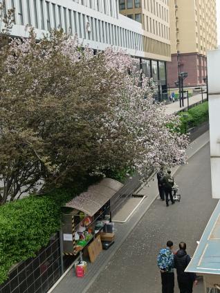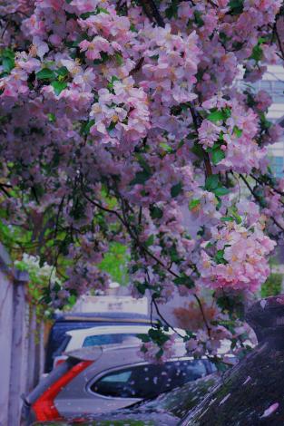 图三:春日花树下;走过天桥时,瞥见右边开的正盛的紫叶李,花树下是一个小小的快递架,小路上落满了花瓣,宣告着春日的尾声。此时正值下班时间,一个个匆忙的归家之人,寻找自己的包裹,带着满足和工作结束的疲惫与归家的轻松。再寻常不过的小事,此时因为有了春花的点缀,让人觉得也心情大好,浪漫无比。