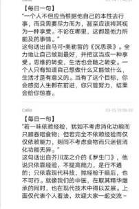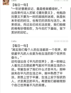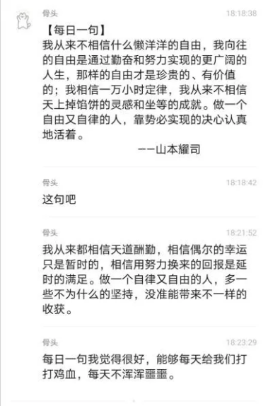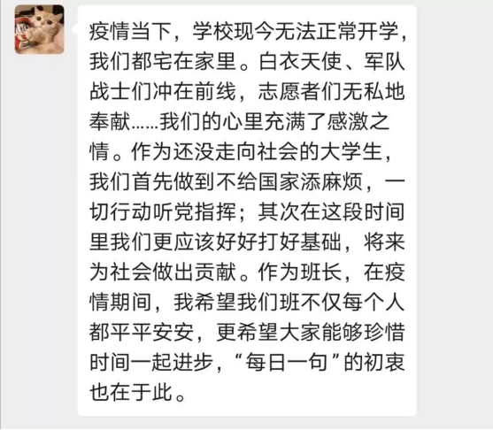 17级制药班班长肖鹏君同学想到了【每日一句】这个活动。从3月8日起,在班群每天带头分享一句话,内容或是激人上进名人名言,或是某本书中让人难以忘怀的一段话,亦或是一段双语赏析,让我们在思考的同时还提高了英语阅读能力。