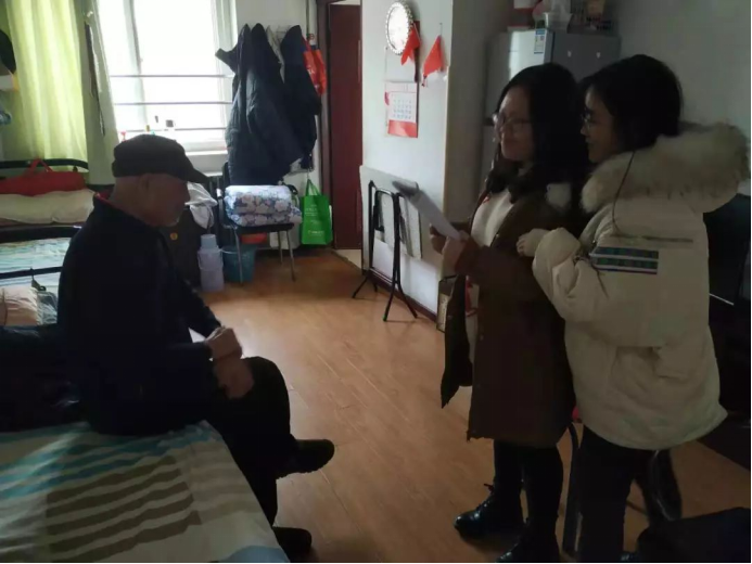 清晨,志愿者在丰台区集合后,于北京义工联盟领队的带领下,两两分组,在爱心敬老院开展敬老尊老志愿服务。